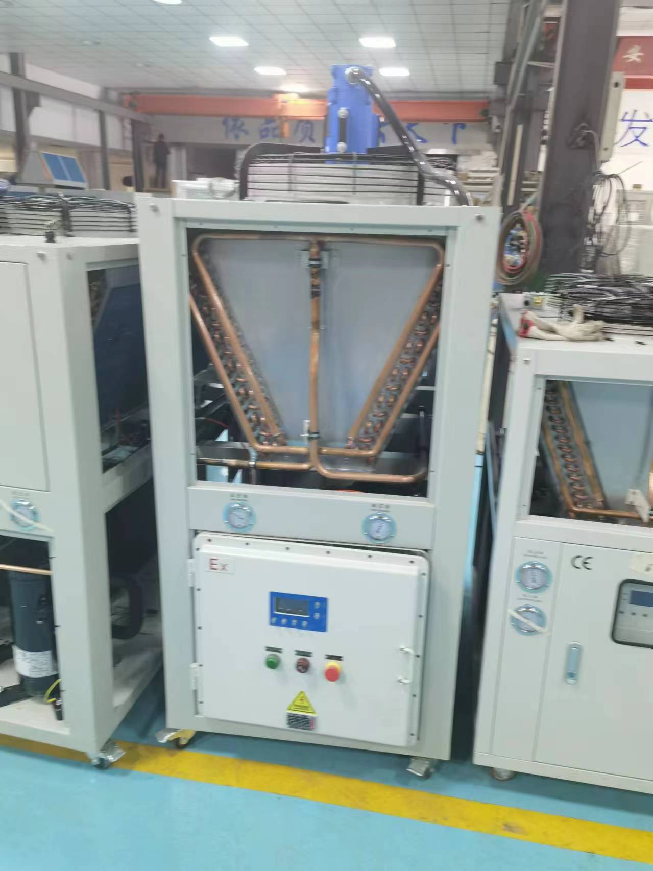 由于冷水機應用的廣泛性和多樣性,有時候經常會用于一些有易燃粉塵,氣體或者化工領域。此時冷水機為了安全的需要在電控、電機、風機等地方做防爆處理,不同場合有不同的特殊要求。故我們稱之為防爆冷水機針對。
